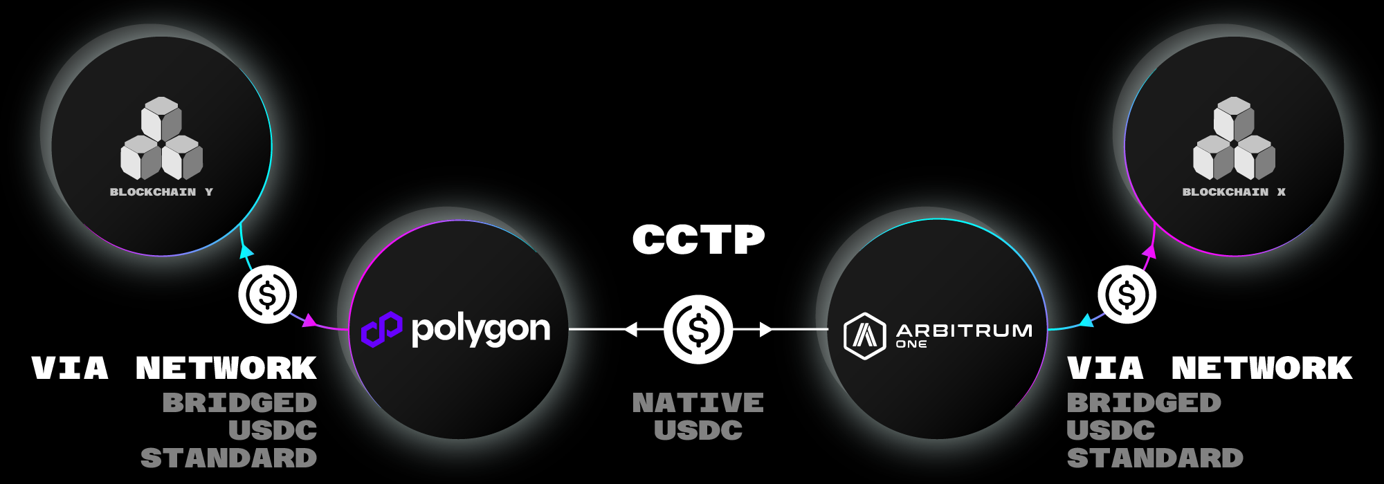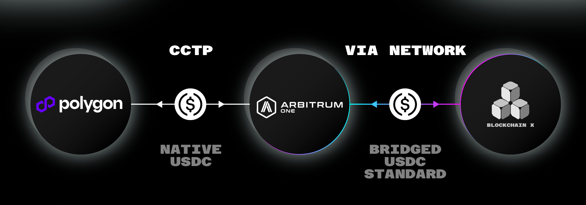 If a user on Blockchain X has USDC on Polygon in their wallet, Proto-USD will burn the native USDC on Polygon, mint native USDC on Arbitrum, and then wrap native USDC on Arbitrum and mint Bridged Standard USDC on Blockchain X – completing the transfer.  &#x20;